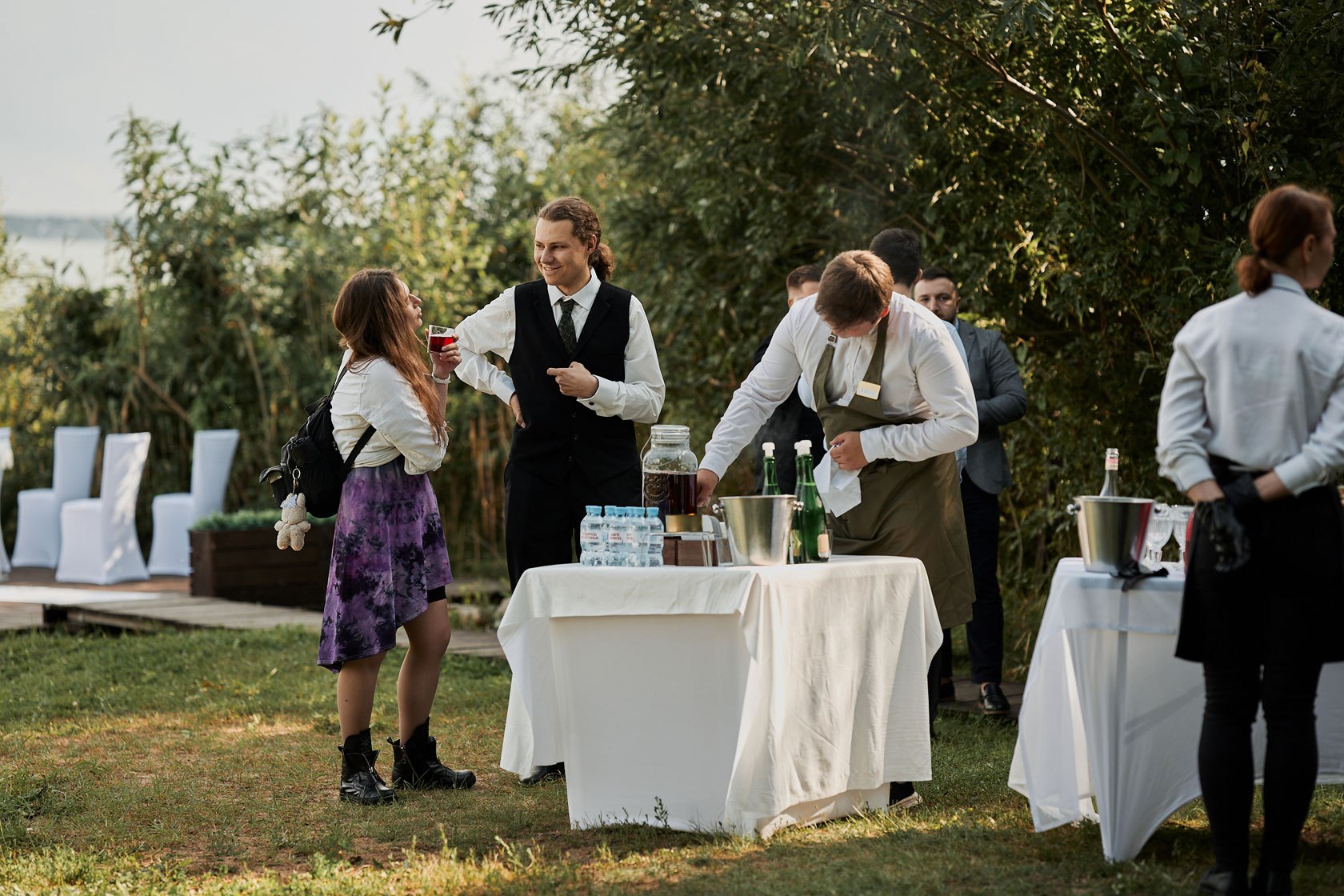 На закрытой территории комплекса Усадьба есть множество локаций. Фуршет, главная роль которого — это общение и знакомство гостей перед основной программой. А фуршет на природе это всегда интереснее, чем организованный фуршет в городском пространстве.
