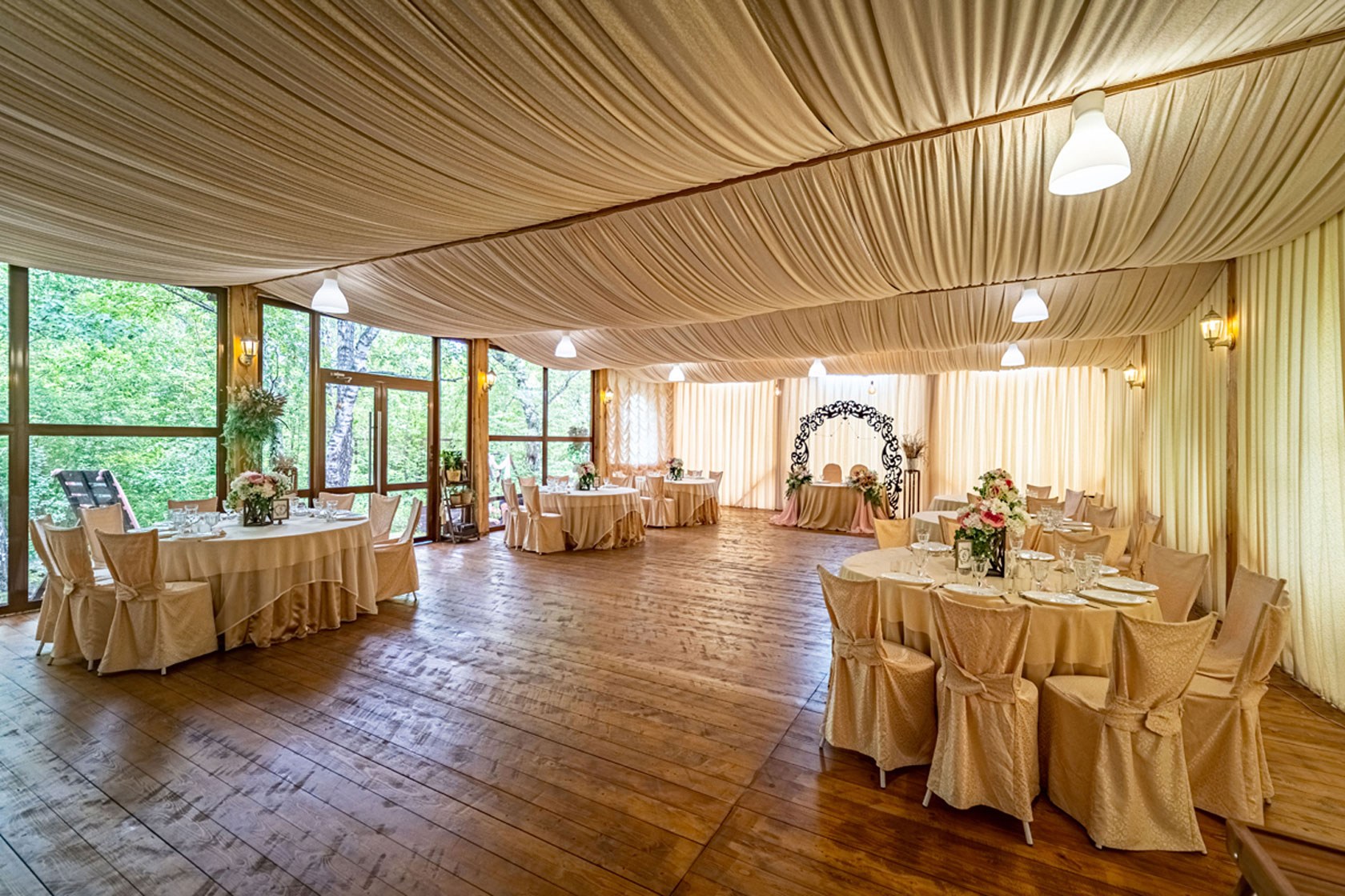 Свадьба в шатре на природе — это один из лучших вариантов празднования мероприятия, если оно планируется в период с апреля по октябрь. И конечно же будет лучше если ваша свадьба будет проходить под шатром не сборно-разборном, а в комфортном, стационарном зале с возможностью подогрева воздуха и охлаждения в знойную летнюю погоду. В Загородном комплексе Усадьба организована закрытая территория леса на берегу озера. Банкетный зал или шатер ориентирован панорамными окнами в лесной массив из которого открывается вид на озеро Сугояк. В зале установлены кондиционеры для комфортного пребывания гостей.